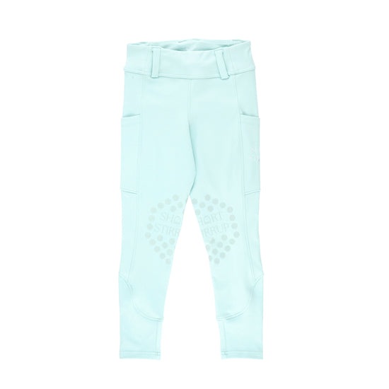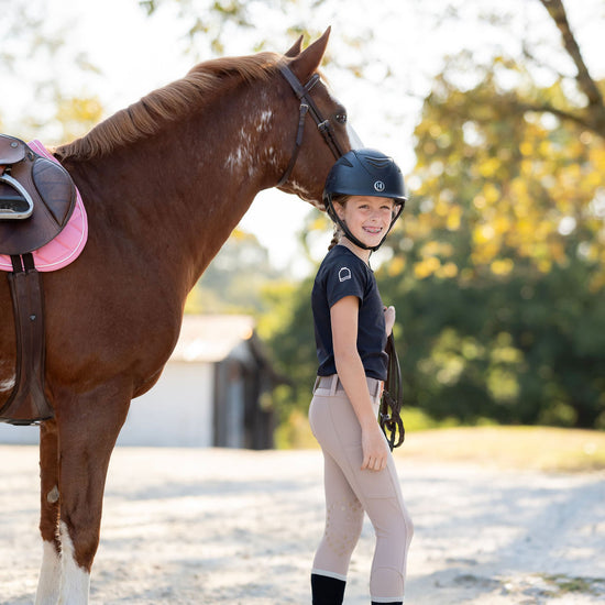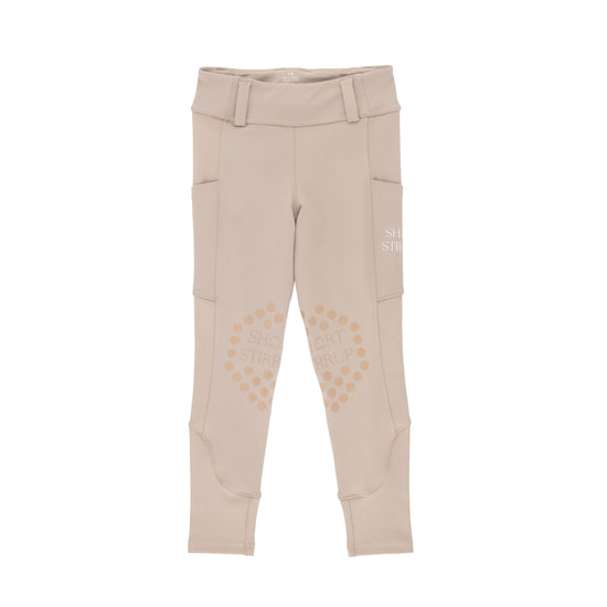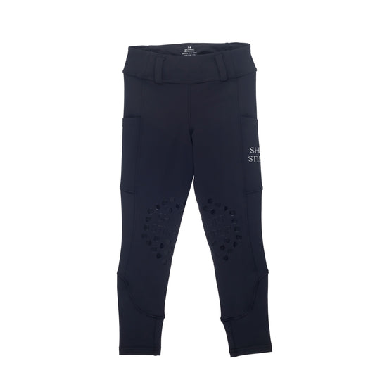 Our signature leggings are the ultimate in children's comfort- we thought through every detail! The leggings are made of silky smooth material and has wide reinforced belt loops, custom Short Stirrup silicone knee patches and two large pockets on both sides (for gloves, pony treats, etc!) Our fabric is both durable (easy to clean!) and comfortable so your young equestrian will be ready for anything- from barn chores, tacking up to schooling under saddle or a leisurely hack. These are sure to be your child's new favorite riding leggings!